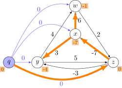 Le graphe initial (à gauche dans l'illustration) possède deux arcs négatifs, mais pas de cycle négatif. On représente ensuite le graphe avec un nouveau sommet q et des arcs de poids nuls vers tous les sommets du graphe initial x, y, z et w. Puis, on montre un arbre des plus courts chemins calculé par l'algorithme de Bellman-Ford avec q comme sommet source. Les valeurs h(v) (en orange dans le dessin) affectées à chaque nœud sont les poids des plus courts chemins de q vers ce nœud. Ces valeurs sont toutes négatives ou nulles, puisque par construction q a déjà un arc de poids nul vers chaque sommet et un plus court chemin ne peut être pas plus lourd que cet arc. Sur la droite est représenté le graphe repondéré. Il est formé en remplaçant chaque poids d'arc poids(u,v) par poids(u,v) + h(u) − h(v). Dans ce graphe repondéré, les poids des arcs sont toujours positifs ou nuls, et un plus court chemin entre deux sommets arbitraires utilise la même séquence d'arcs qu'un plus court chemin entre ces deux mêmes sommets dans le graphe initial. L'algorithme se termine en appliquant plusieurs fois l'algorithme de Dijkstra pour chacun des quatre sommets de départ dans le graphe repondéré.