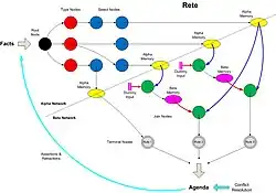 L'algorithme de Rete fournit la représentation logique globale d'une fonctionnalité d'un système de connaissance expert à partir de l'association d'une base des faits (« working memory ») avec une base de règles (« production memory ») dans un système de production de filtrage par motif (pattern matching system, une catégorie de moteur de règle). Une production se compose d'une ou plusieurs conditions et d'un ensemble d'actions qui peuvent être entreprises pour chaque ensemble complet de faits répondant aux conditions.