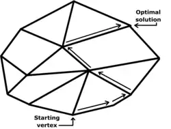 On peut montrer que lorsque le problème a une solution, il a une solution sur un sommet du polyèdre convexe . On sait comment calculer tous ces sommets, qui sont en nombre fini, si bien que le problème de résoudre pourrait être de sélectionner le sommet qui donne à la fonction à minimiser sa plus petite valeur. Cependant, le nombre fini de sommets est en général très grand et dépend souvent exponentiellement des dimensions et du problème, si bien que cette approche ne pourrait être utilisée que pour résoudre des problèmes de petite dimension. L'algorithme du simplexe va rechercher une solution parmi les sommets de , mais en n'en calculant qu'une partie d'entre eux, en éliminant séquentiellement les sommets donnant à la fonction-coût une valeur supérieure à celle obtenue à l'itéré courant.