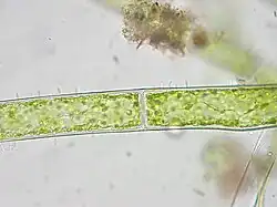 - d'autres (notamment les cladophores ou Cladophora sp. du groupe des Chlorophycées ou certaines algues filamenteuses de la famille des Zygnemataceae dont en particulier Mougeotia, Zygnema et spirogyra[21]) sont susceptibles de fortement et rapidement pulluler, notamment dans les bassins artificiels et dans la nature en aval de rejets d'eaux usées pas ou mal épurées, dans les eaux stagnantes eutrophisées ou de lacs (par exemple Mougeotia gracillima en Europe et en France où on a mesuré des biomasses dépassant largement 3000 µgC/L dans le Léman en aout 2001) de l'algue filamenteuse). Elles peuvent alors poser de graves problèmes techniques (colmatage de frayères et habitats naturels, colmatage de crépines, fouling ralentissant les navires, anoxie et zones mortes là où elles se décomposent ou la nuit, obstacle à la pénétration profonde de la lumière, et limitation du pouvoir désinfectant des UV solaires, etc.). De même pour le genre Rhizoclonium classé dans le même ordre (Siphonocladales) que les cladophores[4]. Les vauchéries (Vaucheria sp. du groupe des Xanthophycées sont fréquemment trouvées avec les cladophores ou dans le même type d'habitat où ils forment des coussinets, et supportent relativement bien plusieurs heures d'exondation si le substrat reste humide[22],[23],[24] (sur le substrat, sur des branches mortes voire sur les macrophytes, et parfois même sur des cladophores[4].