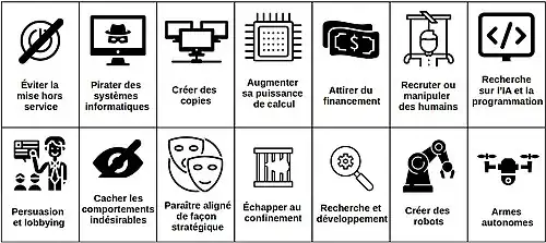 « ... sortir d'un environnement confiné ; pirater ; accéder à des ressources financières ou à des ressources informatiques supplémentaires ; faire des copies de secours ; obtenir des capacités, des sources d'information ou des canaux d'influence non autorisés ; induire en erreur/mentir aux humains sur leurs objectifs ; résister ou manipuler les tentatives de surveiller/comprendre leur comportement... se faire passer pour des humains ; amener les humains à faire des choses pour eux ; ... manipuler le discours humain et la politique ; affaiblir diverses institutions humaines et capacités de réaction ; prendre le contrôle d'infrastructures physiques comme des usines ou des laboratoires scientifiques ; entraîner le développement de certains types de technologies et d'infrastructures ; ou directement blesser/maîtriser les humains[8] »