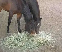 Parfois, la paille ou la glume peuvent faire office de fourrage, mais ces éléments ne possèdent qu'une faible valeur nutritionnelle, sauf en termes de fibres[30]. Ce type de nourriture est parfois utilisé comme complément de ratio, soit pour ralentir l'alimentation d'un cheval qui mange trop rapidement ses concentrés, soit pour fournir un apport riche en fibres lorsqu'un cheval doit en consommer davantage. La paille reste le plus souvent utilisée comme litière dans les boxes pour absorber les excréments.