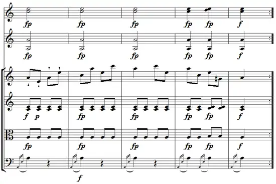 Les deux caractéristiques que nous venons de mentionner peuvent être observées dans l'extrait suivant de la musique turque dans le Concerto pour violon n° 5 de Mozart :
