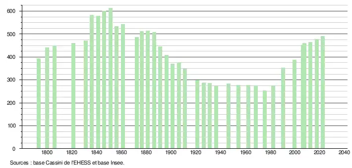L'évolution du nombre d'habitants est connue à travers les recensements de la population effectués dans la commune depuis 1793. Pour les communes de moins de 10 000 habitants, une enquête de recensement portant sur toute la population est réalisée tous les cinq ans, les populations de référence des années intermédiaires étant quant à elles estimées par interpolation ou extrapolation[24]. Pour la commune, le premier recensement exhaustif entrant dans le cadre du nouveau dispositif a été réalisé en 2007[25].