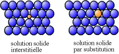 Un élément d'addition qui forme une solution solide avec le métal de base peut être localisé soit entre les atomes de l'élément majoritaire (on parle alors d'« insertion »), soit à la place des atomes du métal majoritaire (on parle alors de « substitution »).