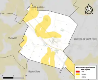 Le retrait-gonflement des sols argileux est susceptible d'engendrer des dommages importants aux bâtiments en cas d’alternance de périodes de sécheresse et de pluie. 30,6 % de la superficie communale est en aléa moyen ou fort (52,8 % au niveau départemental et 48,5 % au niveau national). Sur les 136 bâtiments dénombrés sur la commune en 2019, 19 sont en aléa moyen ou fort, soit 14 %, à comparer aux 70 % au niveau départemental et 54 % au niveau national. Une cartographie de l'exposition du territoire national au retrait gonflement des sols argileux est disponible sur le site du BRGM[17],[Carte 2].