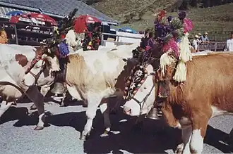 On utilise pour décorer les vaches des couronnes tressées avec des fleurs typiques comme le rhododendron alpin (rhod. ferrugineux) (Almrausch) ou le pin de montagne nain (pinus mugo) ainsi que des chardons dorés (carlina acaulis) mais aussi des rubans et des fleurs en tissu ou en papier.