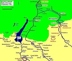 À la fin du mois de , Gavasini passe à l'armée autrichienne d'Italie du maréchal Wurmser et est présent, dans les premiers jours d'août, aux batailles de Lonato et de Castiglione[1]. En septembre, le gros des forces de Wurmser, parti du Trentin dans le Tyrol du Sud, descend la vallée de la Brenta jusqu'à atteindre le Pô à Bassano del Grappa. Le général Quasdanovich, qui commande une division de l'armée de Wurmser, affecte Gavasini à l'arrière-garde avec pour mission d'arrêter la poursuite française à Primolano, près de Cismon del Grappa. À cette fin, Gavasini se voit confier un bataillon de l'IR no 11 Michael Wallis (1 108 hommes), quatre compagnies de l'IR no 42 Erbach (561 hommes), une compagnie des « jägers » Mahony, une demi-compagnie de pionniers et 90 cavaliers du régiment de hussards no 9 Erdödy. En outre, une colonne dirigée par l’Oberst (colonel) Georg von Stentsch vient renforcer son contingent, portant l'effectif de sa troupe à environ 2 800 soldats. Gavasini se retranche avec ses hommes dans une petite vallée, son front partiellement protégé à cet endroit par un coude de la Brenta[3].