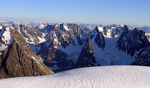 Les Alpes scandinaves sont constituées de deux régions de haute altitude (jusqu'à plus de 2 000 m), une au sud et une au nord, séparées par une zone de plus basse altitude (jusqu'à 1 200 m) à la hauteur du fjord de Trondheim[F 1]. La partie sud, la plus large (jusqu'à 300 km[F 2]), a une forme de dôme[11] centrée sur le Jotunheimen, qui comprend la plupart des plus hauts sommets de la chaîne dont le point culminant, le Galdhøpiggen (2 469 m)[F 1]. La zone du Jotunheimen est elle-même entourée d'autres hauts massifs, tels que Hurrungane, Breheimen, Reinheimen, Dovrefjell et Rondane[F 3]. Cette zone s'étend vers le nord-est jusqu'aux massifs de Sylarna et Helagsfjället à la frontière suédoise, et au sud vers le vaste plateau de l'Hardangervidda et progressivement jusqu'à la mer[F 1]. La partie nord des Alpes scandinaves est plus en longueur et culmine aux massifs de Kebnekaise (2 102 m[note 1],[12]) et Sarek[F 3].