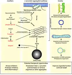 Les agrégats d'α-synucléine forment des fibrilles insolubles que l'on retrouve dans les corps de Lewy caractéristiques de certaines pathologies telles que la maladie de Parkinson[5], la maladie à corps de Lewy et l'atrophie multisystématisée[6],[7].