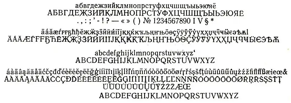 - [Tagirov 1953] (ru) Ф. Ш. Тагиров (dir.), Типо-лаборотория НИИПолиграфмаш, Каталог линотипных и монотипных шрифтов, Moscou, Искусство, (RSL, rab-book)