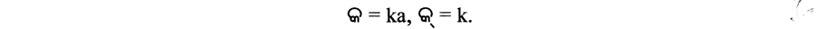 Comme dans les autres écritures abougida, les consonnes de l'odia ont des voyelles inhérentes. Cette voyelle est transcrite par un « a » mais elle se prononce [ɔ]. Son absence est indiquée par un halanta (virāma):