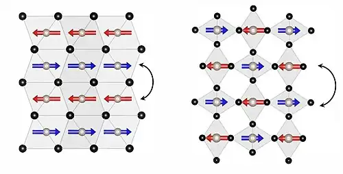 Dans un matériau ferromagnétique, tous les spins peuvent être alignés par l'application d'un champ magnétique et le rester après sa suppression, créant ainsi une aimantation rémanente. Cette aimantation peut être inversée par l'application d'un autre champ magnétique, ce qui permet d'utiliser ces matériaux comme mémoires informatiques. Cette technique a donné naissance à la spintronique, dans laquelle les informations sont codées via le spin des électrons plutôt que par la charge. Dans les années 1930, il est apparu qu'il était beaucoup plus courant que les spins d'atomes voisins pointent dans des directions opposées, de sorte que leur aimantation nette s'annule (antiferromagnétisme). Parce que cette disposition décalée des spins est beaucoup plus stable que la disposition uniforme, les matériaux antiferromagnétiques sont presque impossibles à aimanter : pendant la Seconde Guerre mondiale, des bobines électriques ont été utilisées pour que les coques des navires aient un comportement antiferromagnétique et échappent aux mines rampantes (attirées par les corps aimantés). Plus récemment, des dispositifs spintroniques ont été constitués à partir d'antiferromagnétiques : bien que plus difficiles à manipuler, leurs spins peuvent basculer jusqu'à 1 000 fois plus rapidement que ceux des ferromagnétiques, ce qui permet un stockage et un traitement des informations plus performants et plus économes en énergie[1].