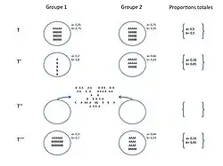 Au temps T’ : la sélection a opéré (par exemple une prédation) et comme les individus A ont une valeur sélective individuelle plus faible que les individus B, ils résistent moins à la prédation et ainsi, on observe une perte en individu A plus importante qu’en individus B au sein de chaque groupe. Cependant au niveau de l’ensemble des 2 groupes la proportion de A a augmenté (a=0,55 et b=0,45).Ceci est dû au fait que le groupe 2 qui avait un nombre plus important de A en T a connu globalement une prédation plus faible que le groupe 1 car elle avait une valeur sélective globale (grâce à l’altruisme qui profite au groupe entier) plus importante que le groupe 1. Ceci est un exemple d’illustration du paradoxe de Simpson. En réalité chaque groupe n’est pas isolé, et s’il l’était, l’altruisme ne pourrait évoluer en raison du fait que ces taux diminuent dans chaque groupe.