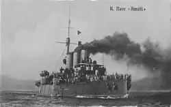 Le Amalfi et son navire-jumeau, le Pisa, sont entrés en service en 1909, mais les sources contiennent peu d'informations sur leurs activités jusqu'à la guerre italo-turque de 1911. Le 24 septembre 1911, cinq jours avant que le royaume d'Italie ne déclare la guerre à l'Empire ottoman, le Amalfi quitte Syracuse pour Tripoli au sein d'une escadre comprenant les cuirassés Roma et Napoli, les croiseurs blindés Pisa, Giuseppe Garibaldi, Varese et Francesco Ferruccio, et deux flottilles de destroyers[5]. Cinq jours plus tard, le Amalfi et plusieurs autres navires sont vus en train de prendre du charbon à Malte[6], avant de se diriger vers le blocus de Tripoli[7].