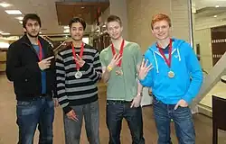 Membres de l'équipe du Championnat d'échecs universitaire 2012 de Western. Aman Hambleton est le troisième à partir de la gauche