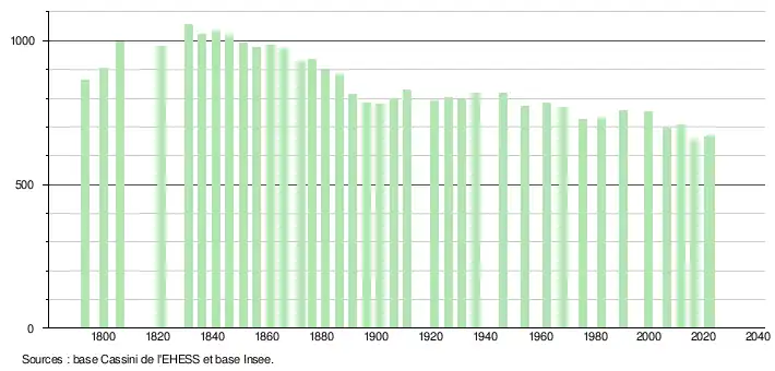 forêts (35,8%), prairies (25,4%), terres arables (16,3%), zones agricoles hétérogènes (10,1%), milieux à végétation arbustive et/ou herbacée (6,9%), zones urbanisées (3,9%), zones industrielles ou commerciales et réseaux de communication (1,6%)[12]. L'évolution de l’occupation des sols de la commune et de ses infrastructures peut être observée sur les différentes représentations cartographiques du territoire: la carte de Cassini (XVIIIesiècle), la carte d'état-major (1820-1866) et les cartes ou photos aériennes de l'IGN pour la période actuelle (1950 à aujourd'hui)[Carte 1].