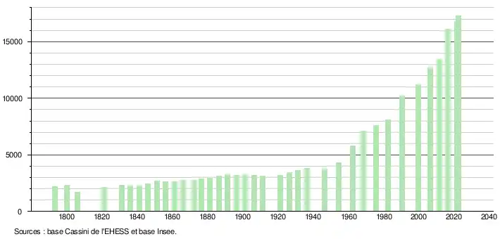 L'évolution du nombre d'habitants est connue à travers les recensements de la population effectués dans la commune depuis 1793. Pour les communes de plus de 10 000 habitants les recensements ont lieu chaque année à la suite d'une enquête par sondage auprès d'un échantillon d'adresses représentant 8 % de leurs logements, contrairement aux autres communes qui ont un recensement réel tous les cinq ans[40],[Note 6].