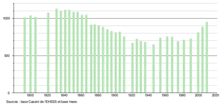 L'évolution du nombre d'habitants est connue à travers les recensements de la population effectués dans la commune depuis 1793. À partir du , les populations légales des communes sont publiées annuellement dans le cadre d'un recensement qui repose désormais sur une collecte d'information annuelle, concernant successivement tous les territoires communaux au cours d'une période de cinq ans. Pour les communes de moins de 10 000 habitants, une enquête de recensement portant sur toute la population est réalisée tous les cinq ans, les populations légales des années intermédiaires étant quant à elles estimées par interpolation ou extrapolation[12]. Pour la commune, le premier recensement exhaustif entrant dans le cadre du nouveau dispositif a été réalisé en 2004[13],[Note 1].