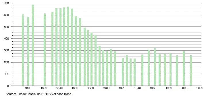L'évolution du nombre d'habitants est connue à travers les recensements de la population effectués dans la commune depuis 1793. À partir du , les populations légales des communes sont publiées annuellement dans le cadre d'un recensement qui repose désormais sur une collecte d'information annuelle, concernant successivement tous les territoires communaux au cours d'une période de cinq ans. Pour les communes de moins de 10 000 habitants, une enquête de recensement portant sur toute la population est réalisée tous les cinq ans, les populations légales des années intermédiaires étant quant à elles estimées par interpolation ou extrapolation[12]. Pour la commune, le premier recensement exhaustif entrant dans le cadre du nouveau dispositif a été réalisé en 2008[13],[Note 1].