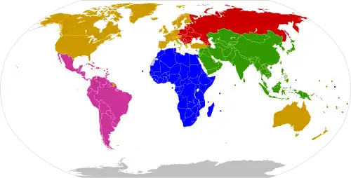 - selon un critère géopolitique, une « représentation […] qui va à l’encontre de la division classique et géologique du continent en trois parties », un ensemble que l’on peut opposer à l’Amérique du Nord anglo-saxonne[23]. C'est à peu près (à l'exception notable des territoires français en Amérique et de Porto Rico) celle retenue par l'Organisation des Nations unies (ONU) pour l'ensemble de 33 États membres qu'elle désigne comme le groupe des États d'Amérique latine et des Caraïbes[24].