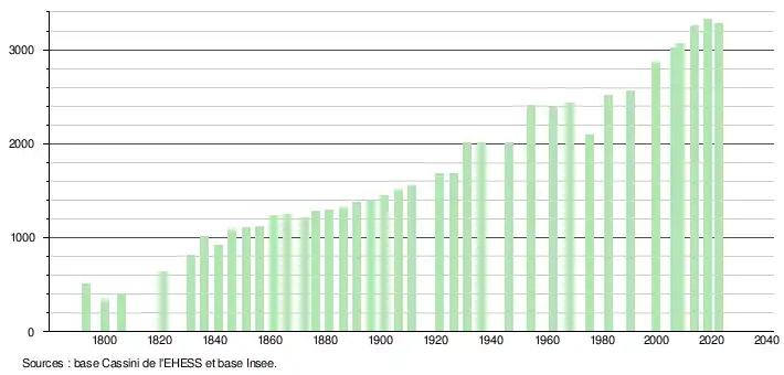 L'évolution du nombre d'habitants est connue à travers les recensements de la population effectués dans la commune depuis 1793. Pour les communes de moins de 10 000 habitants, une enquête de recensement portant sur toute la population est réalisée tous les cinq ans, les populations de référence des années intermédiaires étant quant à elles estimées par interpolation ou extrapolation[24]. Pour la commune, le premier recensement exhaustif entrant dans le cadre du nouveau dispositif a été réalisé en 2008[25].