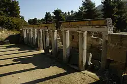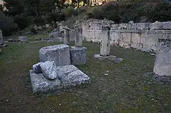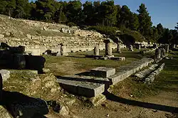 - ↑ La stoa est datée par la forme des chapiteaux doriques.