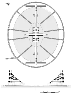 La forme générale de l'édifice est celle d'une ellipse dont les axes mesurent 148 et 122 mètres ; les axes de l'arène mesurent respectivement 65 et 39 mètres[45], son périmètre se monte à 427 mètres[8]. La construction avait une hauteur de 36 mètres[49].