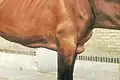 - La phase d'état comporte une aggravation des symptômes généraux (abattement plus marqué, etc.) et oculaires (pétéchies plus nombreuses), et la formation de pétéchies sur la muqueuse buccale et la face inférieure de la langue. Certains chevaux présentent en outre, isolés ou associés, des symptômes d'atteinte hépato-rénale (polyurie, albuminurie), une diarrhée fétide, striée de sang, avec de légères coliques, des symptômes de myocardite et des œdèmes déclives (photo).