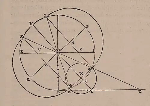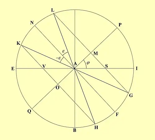- Tracer symétriquement par rapport à NFC, les segments KG et LH à partir de l'angle de l'obliquité ε ; prolonger ces segments jusqu'à T et R sur la ligne méridienne (projection gnomonique). Ces points seront les points remarquables des solstices.