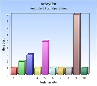 En revanche quand le tableau est plein, cas rare, il faut allouer un nouveau tableau et en recopier tous les éléments ; la complexité « classique » de cette opération est en O(n), où n est la taille du tableau courant.