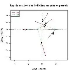 5. Représentations superposées des individus « vus » par chacun des groupes. Un individu considéré du point de vue d’un seul groupe est dit individu partiel (parallèlement, un individu considéré du point de vue de l’ensemble des variables est dit individu moyen car il est au barycentre de ses points partiels). Le nuage partiel rassemble les individus du point de vue du seul groupe (soit ) : c’est le nuage analysé dans l’analyse factorielle (ACP ou ACM) séparée du groupe . La représentation superposée des fournie par l’AFM est analogue, dans sa finalité, à celle fournie par l’analyse procustéenne.
