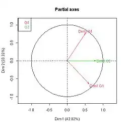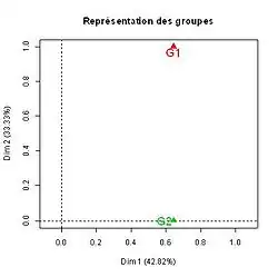 6. Représentations des groupes de variables en tant que tels. Dans ces graphiques, chaque groupe de variables est représenté par un point. Deux groupes de variables sont d’autant plus proches qu’ils définissent la même structure sur les individus : à la limite, deux groupes de variables qui définissent des nuages d’individus homothétiques sont confondus. La coordonnée du groupe le long de l’axe est égale à la contribution du groupe à l’inertie du facteur de rang de l’AFM. Cette contribution peut s’interpréter comme un indicateur de liaison (entre le groupe et l’axe de rang , d’où le nom de carré des liaisons donné à ce type de représentation). Cette représentation existe aussi dans d’autres méthodes factorielles (ACM et AFDM en particulier) auquel cas les groupes de variables sont réduits chacun à une seule variable.
