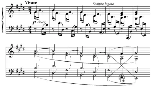 est transféré de la basse vers le soprano, tandis que mi est transféré du soprano vers la basse. L’échange est marqué par deux lignes obliques entrecroisées reliant ces notes.