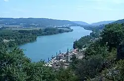 D'est en ouest, sa « largeur » est plus modeste. Son territoire comprend l'étroite plaine fertile de la rive droite et monte jusqu'au bord supérieur du plateau, en limite avec les communes de Saint-Désirat, Saint-Étienne-de-Valoux et Talencieux[1].