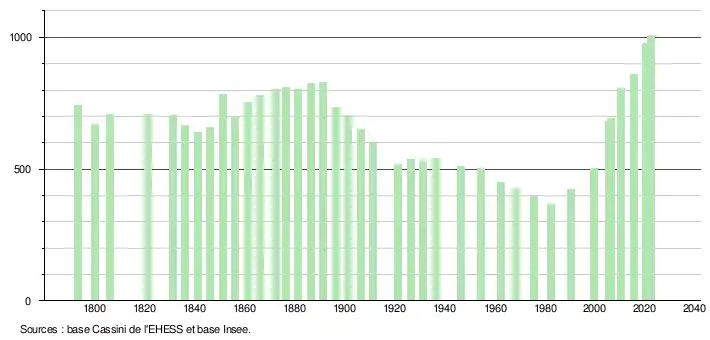 L'évolution du nombre d'habitants est connue à travers les recensements de la population effectués dans la commune depuis 1793. Pour les communes de moins de 10 000 habitants, une enquête de recensement portant sur toute la population est réalisée tous les cinq ans, les populations de référence des années intermédiaires étant quant à elles estimées par interpolation ou extrapolation[28]. Pour la commune, le premier recensement exhaustif entrant dans le cadre du nouveau dispositif a été réalisé en 2005[29].