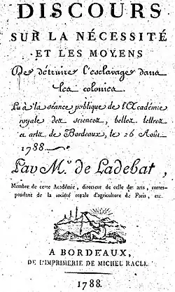 - 1788 - André-Daniel Laffon de Ladebat, Académie des sciences, belles-lettres et arts de Bordeaux, Discours sur la nécessité et les moyens de détruire l'esclavage dans les colonies : lu à la séance publique de l'Académie royale des sciences, belles lettres et arts de Bordeaux, le 25 août 1788 (œuvre littéraire), Bordeaux, , [lire en ligne].