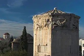 - ↑ (en) Joseph V. Noble et Derek J. de Solla Price, « The Water Clock in the Tower of the Winds », American Journal of Archaeology, vol. 72, no 4, , p. 353.