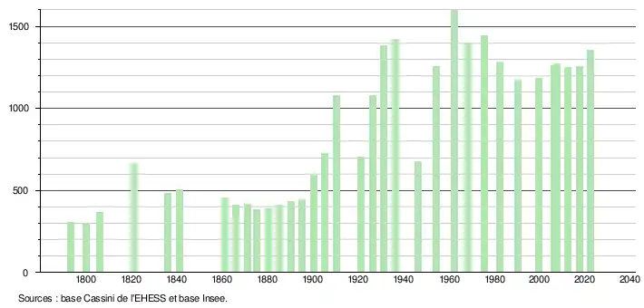 L'évolution du nombre d'habitants est connue à travers les recensements de la population effectués dans la commune depuis 1793. Pour les communes de moins de 10 000 habitants, une enquête de recensement portant sur toute la population est réalisée tous les cinq ans, les populations de référence des années intermédiaires étant quant à elles estimées par interpolation ou extrapolation[18]. Pour la commune, le premier recensement exhaustif entrant dans le cadre du nouveau dispositif a été réalisé en 2007[19].