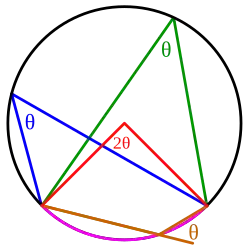 - 1 2 Pour une démonstration, voir par exemple le chapitre « Angle inscrit et angle au centre » de la leçon « Théorème de l'angle inscrit » sur Wikiversité.