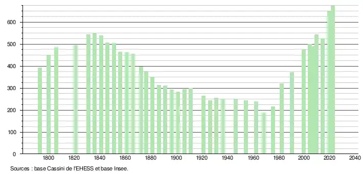 L'évolution du nombre d'habitants est connue à travers les recensements de la population effectués dans la commune depuis 1793. Pour les communes de moins de 10 000 habitants, une enquête de recensement portant sur toute la population est réalisée tous les cinq ans, les populations de référence des années intermédiaires étant quant à elles estimées par interpolation ou extrapolation[18]. Pour la commune, le premier recensement exhaustif entrant dans le cadre du nouveau dispositif a été réalisé en 2004[19].