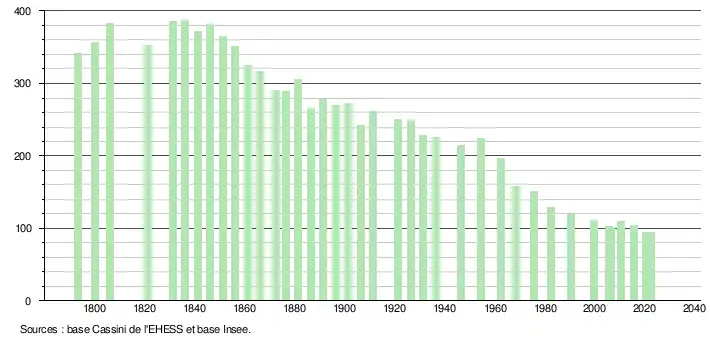 L'évolution du nombre d'habitants est connue à travers les recensements de la population effectués dans la commune depuis 1793. Pour les communes de moins de 10 000 habitants, une enquête de recensement portant sur toute la population est réalisée tous les cinq ans, les populations de référence des années intermédiaires étant quant à elles estimées par interpolation ou extrapolation[38]. Pour la commune, le premier recensement exhaustif entrant dans le cadre du nouveau dispositif a été réalisé en 2005[39].