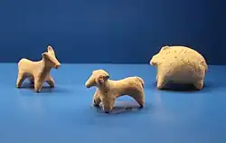 Le Néolithique est la grande période de domestication d'animaux, quand sont domestiqués les quatre ongulés qui fournissent par la suite l'essentiel des animaux domestiques de la région. Le phénomène se fait donc sur quelques siècles, et est centré sur la région du Taurus et du Nord du Levant (hautes vallées de l'Euphrate et du Tigre), avec une diffusion rapide vers le sud du Levant et vers le Zagros à l'est. Les caprinés semblent avoir été les premiers domestiqués, mais les recherches récentes ont mis en avant le fait que les deux autres les ont rapidement suivis. La chèvre apparaît entre 8500 et 8000, à la suite de la domestication de son espèce sauvage (Capra aegagrus) vivant dans les terrains hauts allant de l'Anatolie au Pakistan[20],[21]. Cet animal aurait pu être domestiqué dans plusieurs foyers vers une même période : la région du Taurus et la Syrie (Abu Hureya), et dans le Zagros (Ganj-i Dareh). Le mouton est domestiqué au même moment à partir du mouflon vivant dans les régions sèches de l'Anatolie orientale et du Nord de l'Irak et de l'Iran actuels, là encore dans le Taurus et le Nord du Levant (Hallan Çemi, Nevalı Çori), et met plus de temps à se diffuser sur les sites du Levant Sud et du Zagros où il ne devient important que deux millénaires plus tard[20],[21]. Les premiers bovins sont apparemment domestiqués un peu plus tard que les ovins et caprins, dans le Moyen Euphrate et le Taurus, même si des recherches récentes tendent à remonter leur domestication à une période contemporaine des deux autres. L'auroch est à l'origine des bovins domestiques les plus courants (Bos taurus : vaches, bœufs, taureaux)[22],[23]. Le cochon est domestiqué à partir du sanglier sauvage, dans le même endroit et en gros à la même période ou un peu plus tard (Cafer Höyük, Hallan Çemi), et se retrouve rapidement sur des sites du sud du Levant et du Zagros[24]. Mais à la différence des trois précédents son élevage n'est jamais très répandu et décline à partir du IIe millénaire[25]. Quoi qu'il en soit, au début du néolithique céramique, vers la seconde moitié du VIIe millénaire av. J.-C., les quatre animaux ongulés domestiqués sont présents sur des sites dans tout le Moyen-Orient[26].