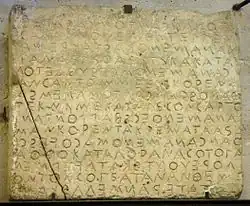 - Vers 480-460 av. J.-C. : code de Gortyne, longue inscription en grande partie intacte regroupant un ensemble de lois concernant la famille[2]. Il révèle une société dorienne hiérarchisé, inégalitaire (les peines varient selon le statut social). La femme a un statut de mineure, plus favorable qu’à Athènes. Elle a le droit de propriété, mais ne gère pas ses biens propres. Elle peut choisir son mari parmi ses prétendants. Elle est protégée contre le viol et en cas de divorce ou de veuvage.