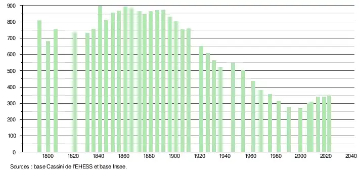 L'évolution du nombre d'habitants est connue à travers les recensements de la population effectués dans la commune depuis 1793. Pour les communes de moins de 10 000 habitants, une enquête de recensement portant sur toute la population est réalisée tous les cinq ans, les populations de référence des années intermédiaires étant quant à elles estimées par interpolation ou extrapolation[26]. Pour la commune, le premier recensement exhaustif entrant dans le cadre du nouveau dispositif a été réalisé en 2008[27].