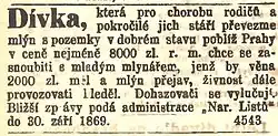 Petite annonce matrimoniale tchèque parue en 1869 dans le Národní listy (de) : la fille d'un meunier âgé cherche un jeune meunier capable d'apporter une dot de 2 000 florins et de reprendre l'affaire.