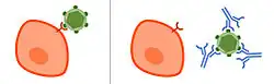 Afin de réussir à s'introduire dans les cellules, les particules virales et les bactéries intracellulaires se servent des molécules qui se trouvent à leurs surfaces dans le but d'interagir avec les récepteurs de surface cellulaire de leur cellule cible. Cela leur permet d'entrer dans la cellule et d'entamer leur cycle de réplication[3].Les anticorps neutralisants peuvent refréner la capacité d'infection en se liant à l'agent pathogène et en bloquant les molécules qui sont nécessaires pour entrer dans les cellules. Cela peut être causé par les anticorps interférant statiquement avec les agents pathogènes, ou bien par les toxines se fixant aux récepteurs des cellules hôtes. Lors d'une infection virale, les anticorps neutralisants peuvent se lier aux glycoprotéines de virus enveloppés ou aux protéines de capside de virus non enveloppés. De plus, les anticorps neutralisants empêchent les particules de subir des changements structurels qui sont souvent nécessaires pour que l'entrée cellulaire soit réussie. Par exemple, les anticorps neutralisants peuvent empêcher les changements conformationnels des protéines virales qui assurent la médiation de la fusion membranaire nécessaire à l'entrée dans la cellule hôte. Dans certains cas, le virus est incapable de causer une infection, même après la dissociation de l'anticorps. Le complexe pathogène-anticorps est finalement absorbé et dégradé par les macrophages [4].