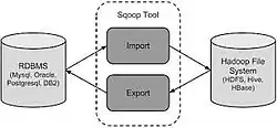 Sqoop est une interface en ligne de commande de l'application pour transférer des données entre des bases de données relationnelles et Hadoop[2]. Il prend en charge le chargement différentiels d'une seule table ou d'une requête SQL ainsi que des tâches enregistrées qui peuvent être exécutées plusieurs fois pour importer les mises à jour effectuées dans une base de données depuis la dernière importation. Les imports peuvent également être utilisés pour remplir les tables dans Hive ou HBase[3]. les Exportations peuvent être utilisés pour mettre les données de Hadoop dans une base de données relationnelle. Le nom Sqoop est un mot valise constitué de sql et de hadoop.En Sqoop est devenu un projet haut niveau d'Apache[4].