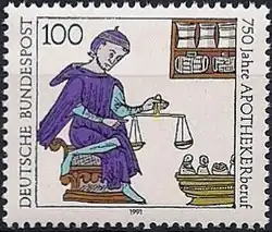 Des communautés d'apothicaires se constituèrent. Elles sont à l'origine du caractère réglementé que la pharmacie conserve aujourd'hui. À l'origine, ces communautés se distinguaient mal de celle des médecins jusqu'à l'édit de Salerne (de) édicté par Frédéric II en 1241, édit qui sépare juridiquement les deux corporations et marque l'acte de naissance de la profession d'apothicaire[9],[8]. Cet édit servant de modèle en Occident mettra cependant plusieurs siècles à devenir effectif, comme le montre la corporation Arte dei Medici e Speziali.