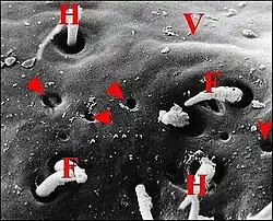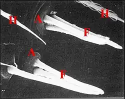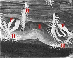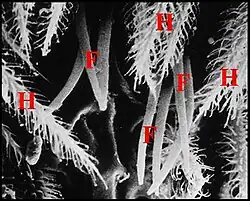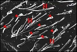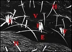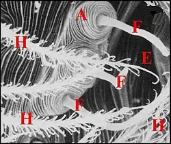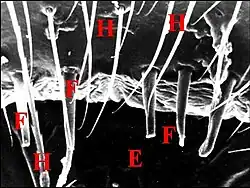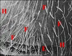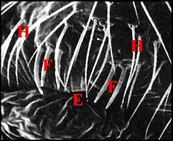 Dans les coupes histologiques (C.H.), à la loupe binoculaire et surtout au microscope électronique à balayage (M.E.B)[14], les fusules se présentent comme des structures de forme assez constante mais de disposition plus variable. Leur compte permet évidemment celui des corps acineux, donc des glandes prégonoporales, souvent difficile et parfois impossible dans les coupes histologiques (C.H.) lorsqu’elles y sont trop nombreuses. Soulignons qu'elles ne doivent pas être confondues avec les poils qui les entourent, surtout lorsqu'ils sont lisses (Fig. ), plutôt que barbelés (Fig. ).